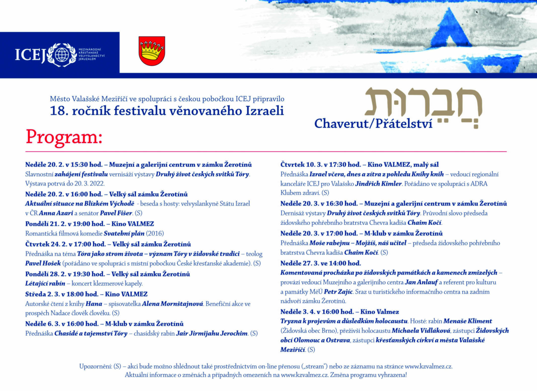 - (S) – akci bude možno shlédnout také prostřednictvím online přenosu (streamu) nebo ze záznamu na stránce http://www.kzvalmez.cz/.