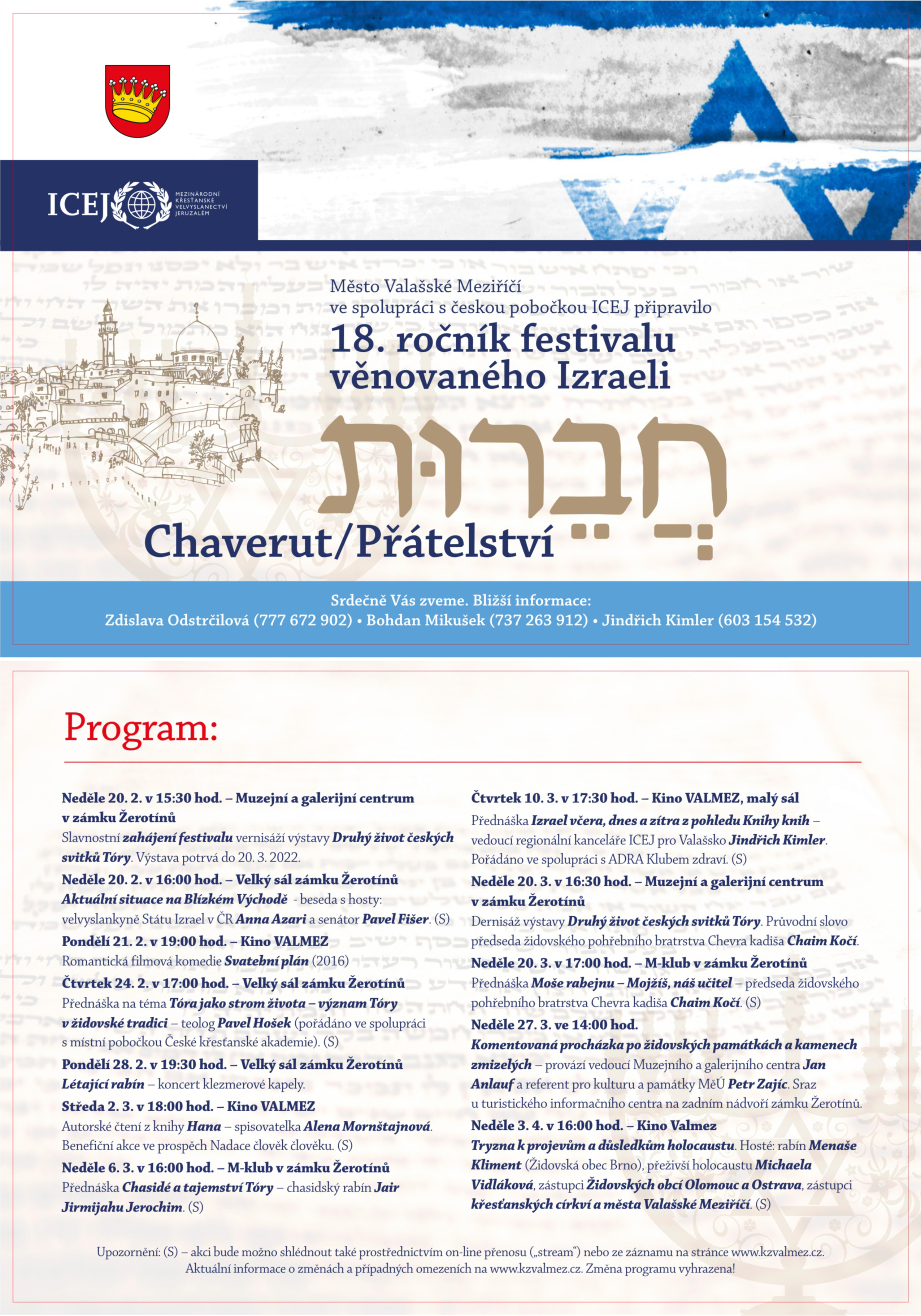 Vedoucí Muzejního a galerijního centra v Zámku Žerotínů Jan Anlauf, referent pro kulturu a památky MěÚ Val. Meziříčí Petr Zajíc, komentovaná procházka po židovských památkách a kamenech zmizelých. Sraz zájemců je u objektu Turistického informačního centra na zadním nádvoří Zámku Žerotínů.