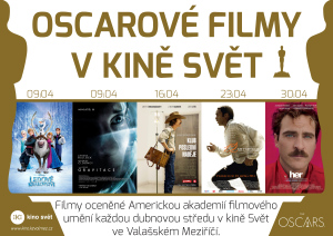 Každoroční udílení Oscarů, cen Americké akademie filmového umění, se uskutečnilo v Los Angeles 2. března 2014. Kino Svět ve Valašském Meziříčí odkazuje na tyto prestižní ceny projekcí pěti snímků, které byly v letošním roce úspěšné. „Návštěvníkům kina chceme umožnit zhlédnutí alespoň několika filmů, jenž v boji o Oscara uspěly. Diváci, kteří vítězné filmy neviděli, tak mají další možnost si na ně zajít a sami posoudit zda dostaly Oscara oprávněně či nikoliv,“ přiblížil Oscarové středy vedoucí kina Svět ve Valašském Meziříčí Jan Grepl.